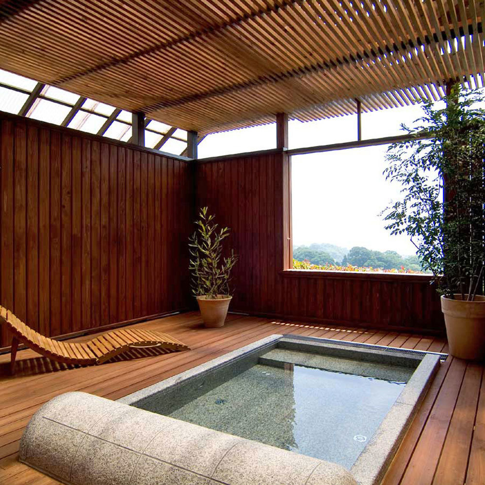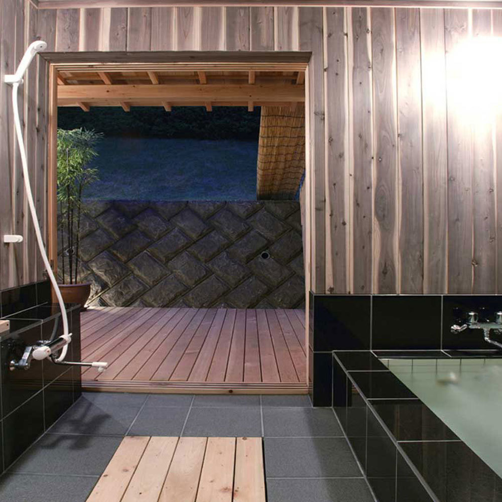 木と石をテーマにしたお風呂に仕上げました。非日常感を演出する、寛ぎのオープンバス。2022 春 湯上がりデッキ&開口扉をリニューアル。
