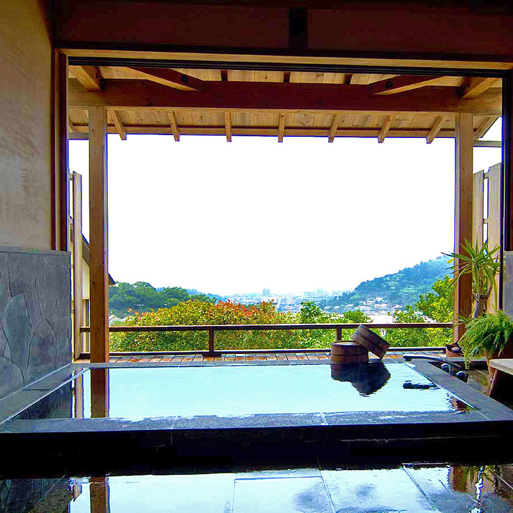 ボンファムには、屋外の外湯が2つ、本館内に内湯が1つ、それぞれ貸切になるプライベート感のある湯処が3つあります。特に外湯は、みかん畑の小路を歩く、小高い場所に造りました。それは、そこにしかない、広々とした景色を眺めながら非日常の体験をしていただくために。1枚の絵画のように切り取った景色を眺めながらリラックスしてください。