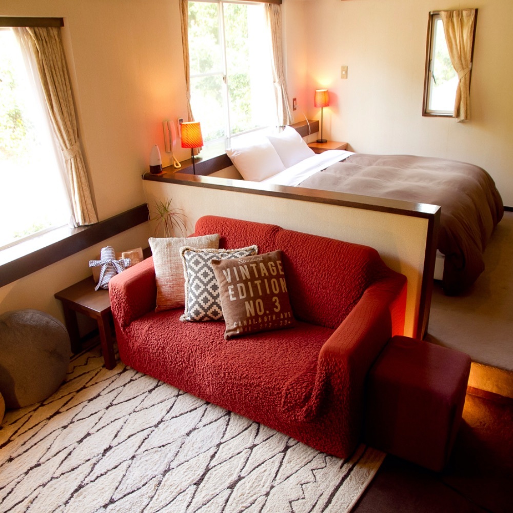 記念日や、ゆったり寛ぐご旅行に。ごろごろとできるリビングスペースには、2シーターのソファーと、もこもこのクッションも。DVDプレーヤーも完備。お好きなDVDを持ってこられて、ふたりでゆっくり映画鑑賞なども。