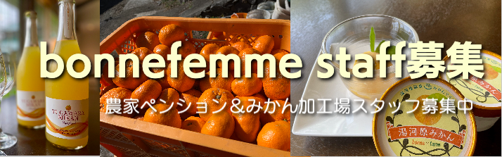 「ボンファム」は神奈川県の湘南の西に位置する、海と山に囲まれた静かな温泉街「湯河原」にある宿泊施設です。 フランス語で良い奥さん=bonnefemme みかん農家の料理好きな奥さんが始めたペンション。