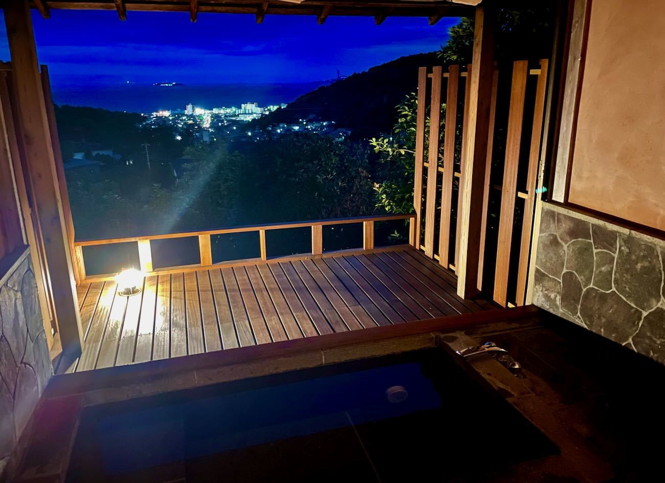 夜は、夜で魅力的な湯河原の街並みの灯りや、初島の灯台、JR東海道線、新幹線が眼下にまるでジオラマのように通り過ぎていくのも楽しい。冬の夜空に輝く星たちもこの温泉の魅力の一つ。ここまでの「抜け感」のある広々とした眺めのお風呂は、湯河原温泉でもそうそうない景色です。景色とお湯に癒されてリラックスのひと時を。