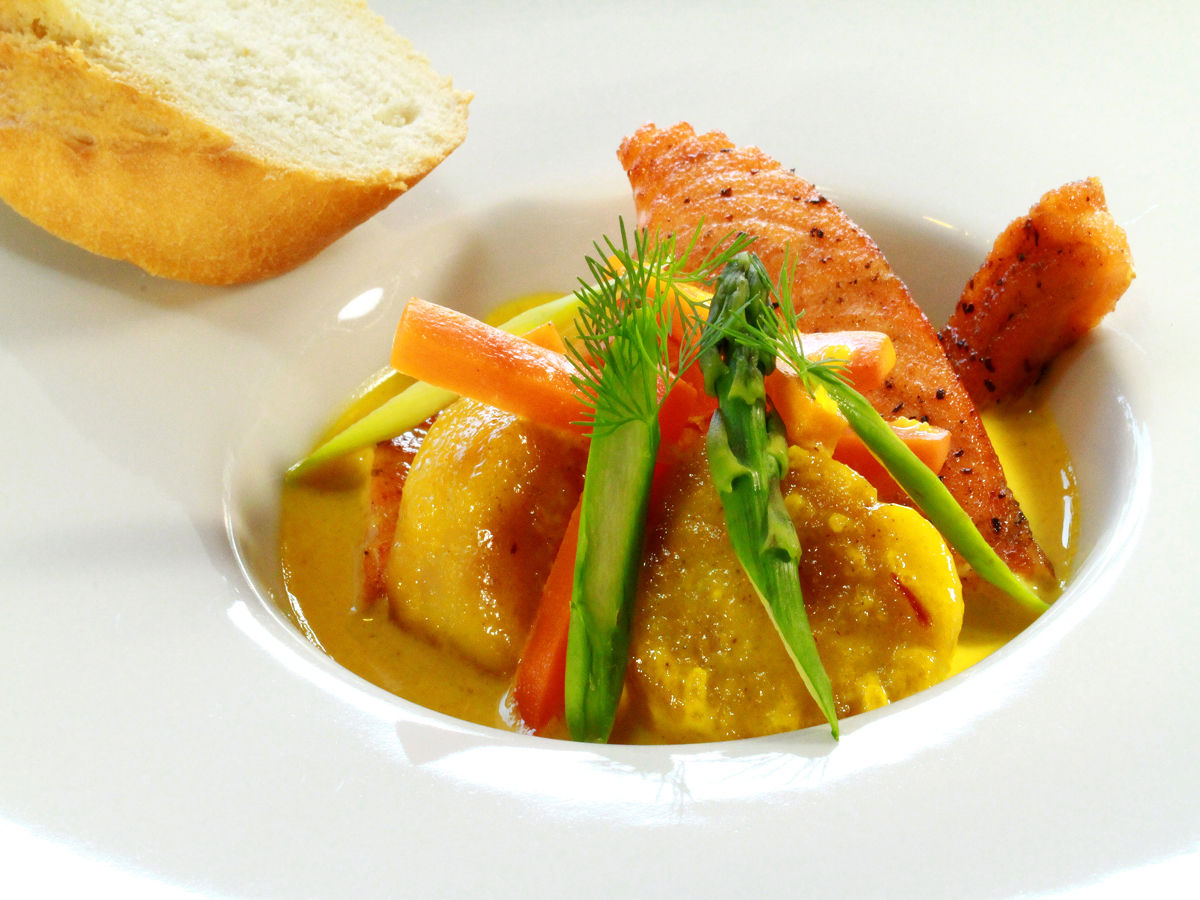 元々代々みかん農家からボンファムを開業。現在も農家を続けながら宿業を営んでいます。茅葺屋根の古民家をリノベーションした、真っ白な漆喰の壁と太い梁が特徴的な居心地のいいダイニングでご用意するのは創作フレンチ。地元産の【ブランドポーク】や相模湾の《海の幸》などの素材活かし、”気取らない”お箸でいただくディナーが魅力です。